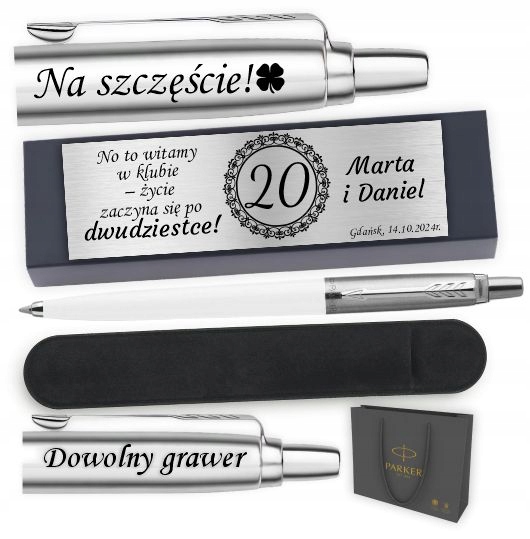 Parker Jotter Biały CT z grawerem i srebrną tabliczką to idealne połączenie elegancji, minimalizmu i klasy.