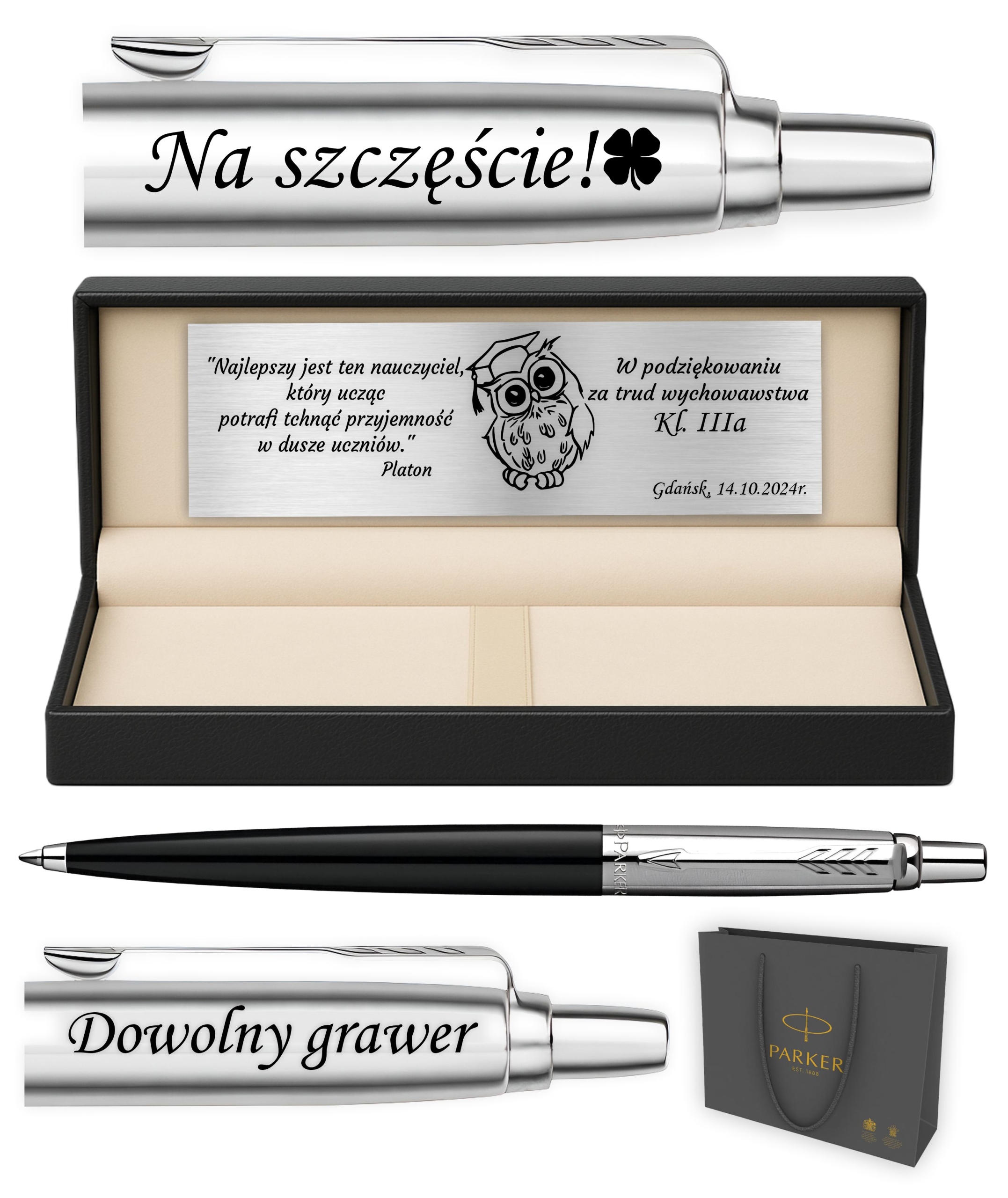 Dzięki precyzyjnemu grawerowi oraz srebrnej tabliczce z dedykacją, zestaw staje się wyjątkowym, personalizowanym prezentem na każdą okazję.