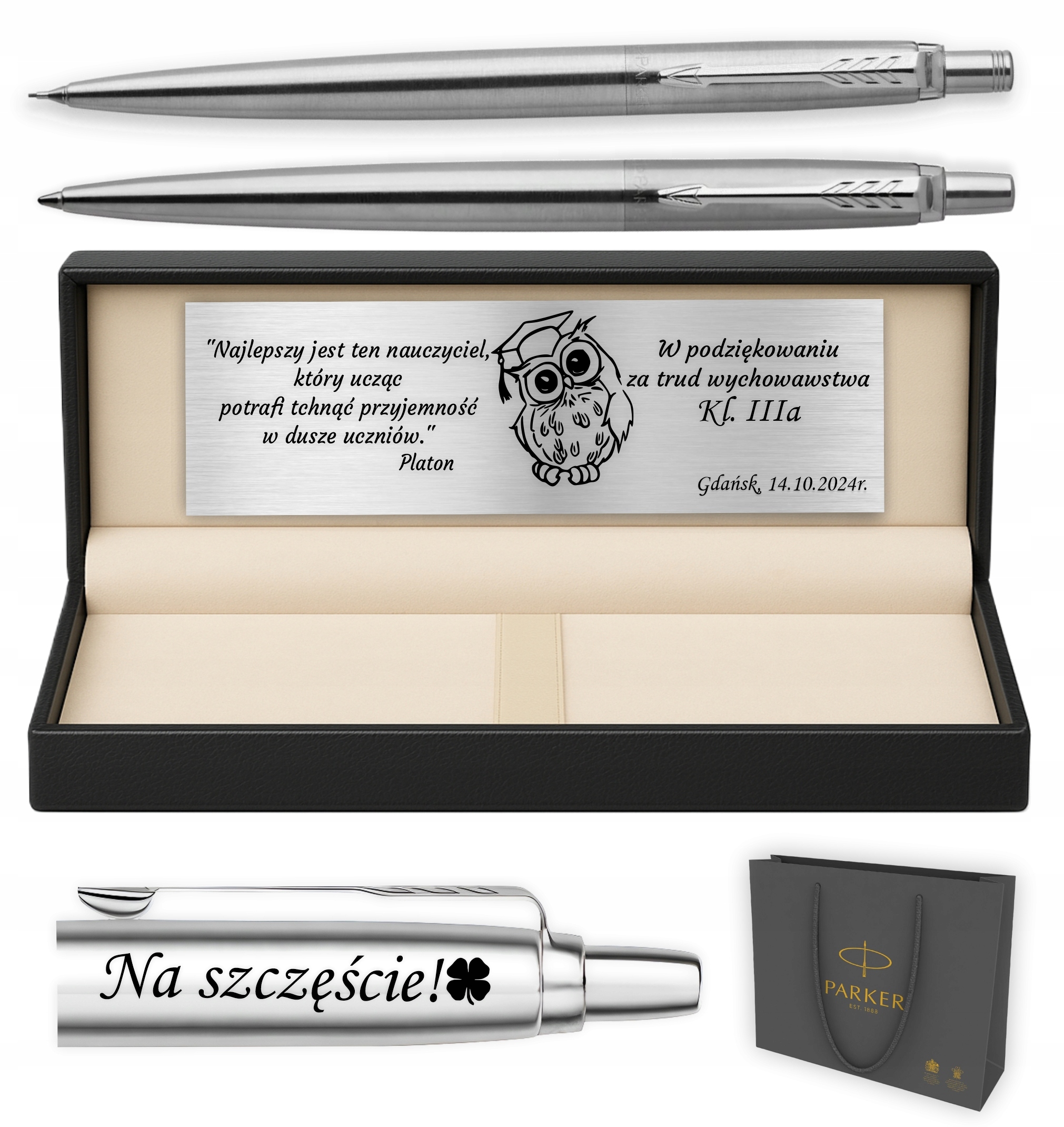 - na tabliczce – pełna dedykacja + grafika (np. sowa, pióro, serce, koniczynka)