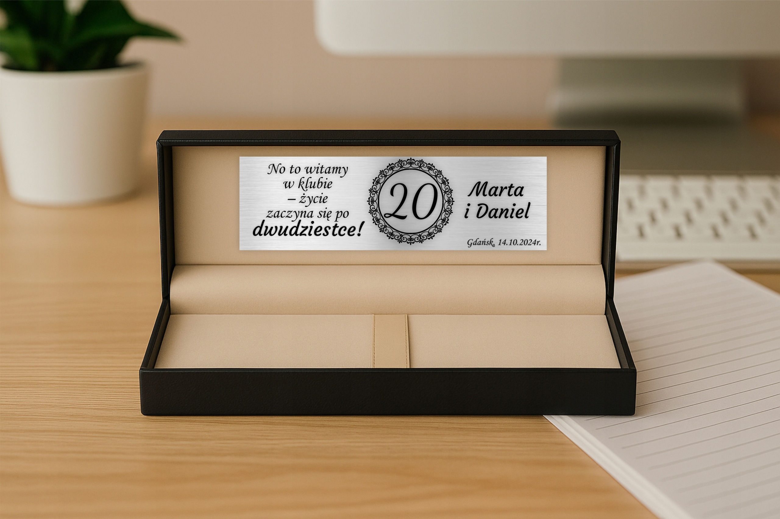 Dzięki grawerowi laserowemu oraz dedykowanej tabliczce wewnątrz pudełka, zestaw staje się wyjątkową, osobistą pamiątką.