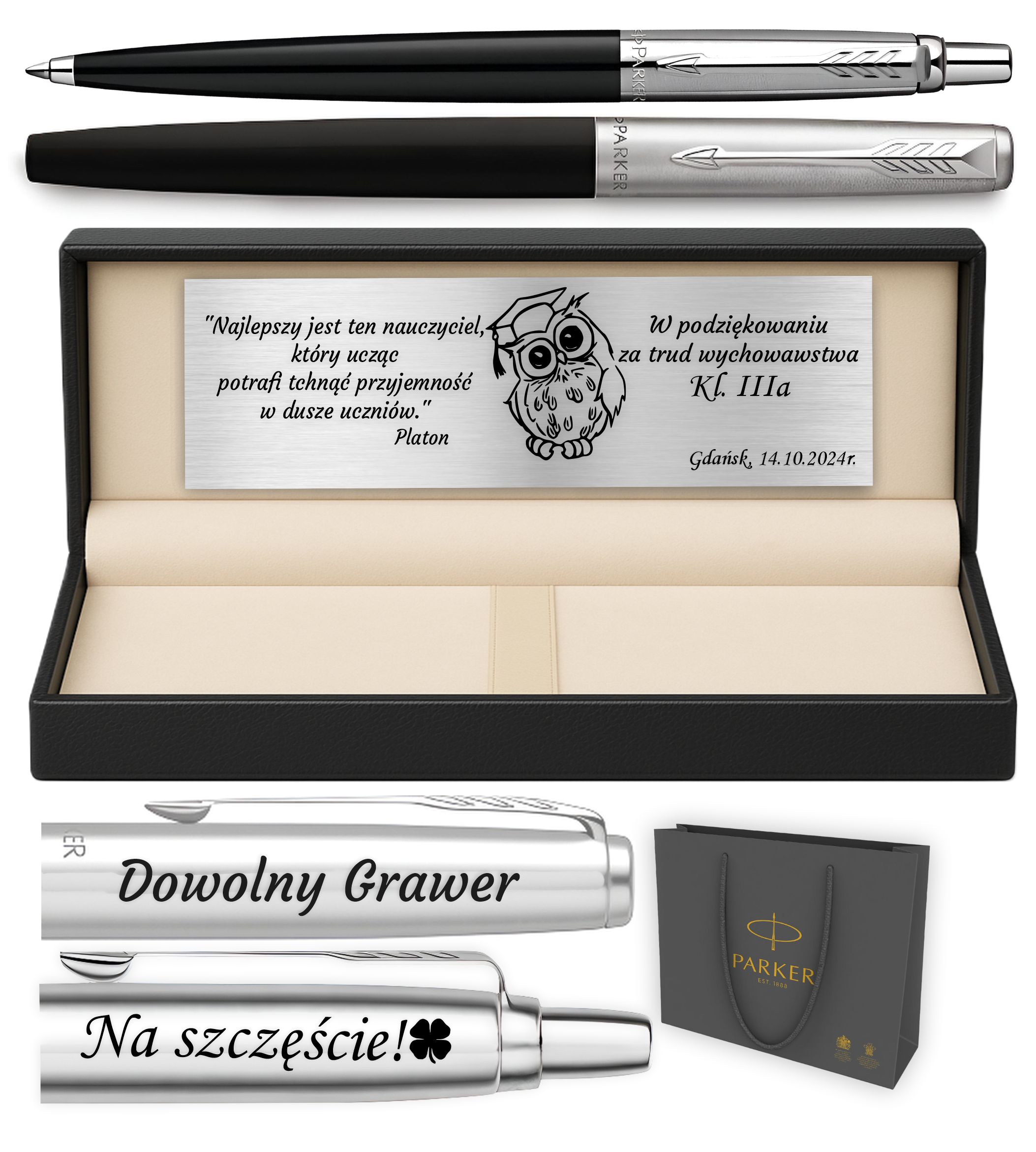 Pióro i długopis Parker Jotter 60 Czarny z grawerem oraz srebrną tabliczką dedykacyjną to doskonały sposób, by wyrazić wdzięczność i uznanie dla nauczyciela, wychowawcy lub mentora.