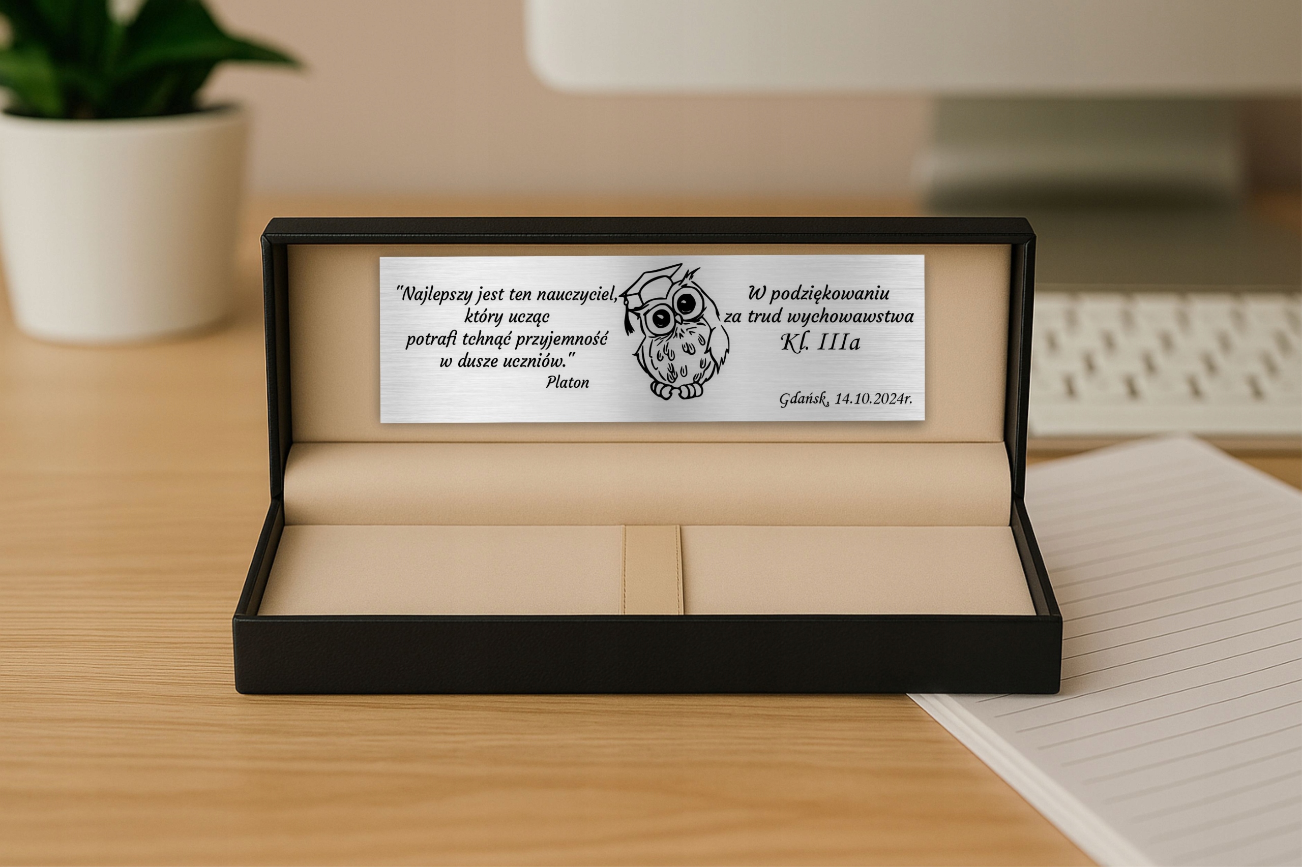 Srebrna tabliczka z indywidualnym napisem – idealna na cytat, życzenia lub podpis klasy