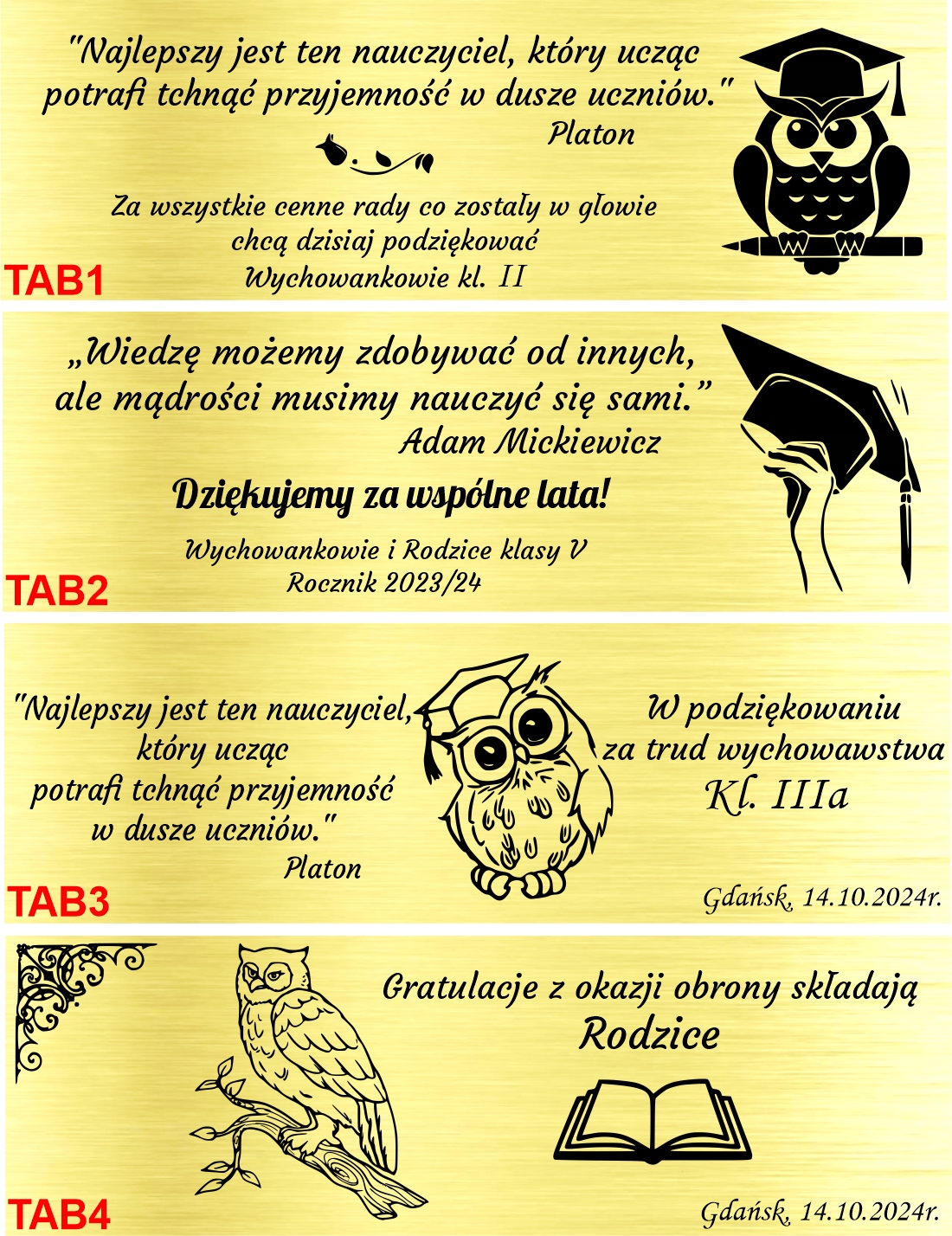 • Złota tabliczka z dedykacją – dowolny tekst + grafika (np. sowa, cytat, data)