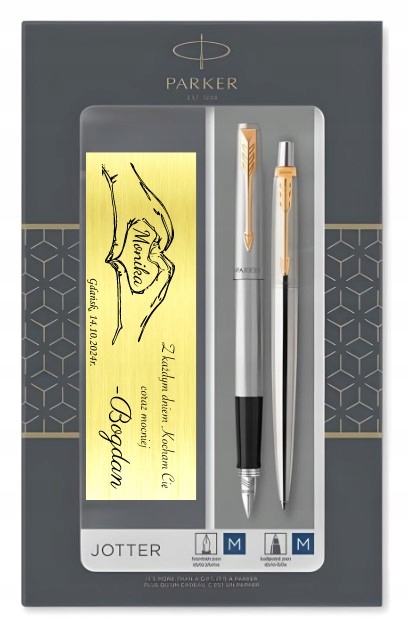 Zestaw Parker Jotter – pióro stalowe GT + długopis stalowy GT to idealne połączenie klasyki, jakości i prestiżu. Kultowa linia Jotter, znana od lat z niezawodności i pięknego designu, tutaj występuje w wersji ekskluzywnego kompletu w pudełku Parker z personalizacją.