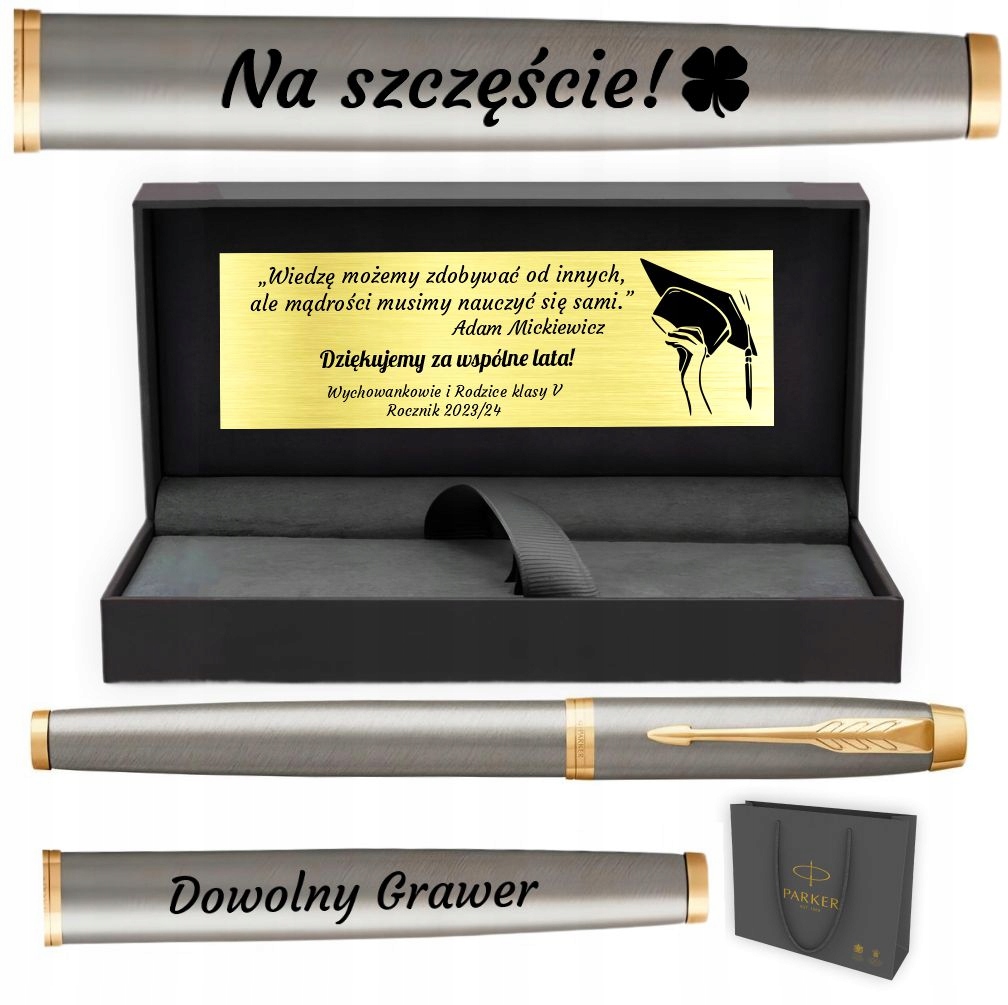 • Złota tabliczka z dedykacją w pudełku Parker – personalizowana, elegancka, idealna na prezent