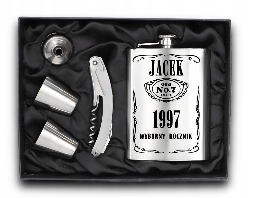 W zestawie znajdują się dwa kieliszki o pojemności 30 ml, praktyczny lejek, który ułatwia korzystanie z piersiówki oraz nóż kelnerski
