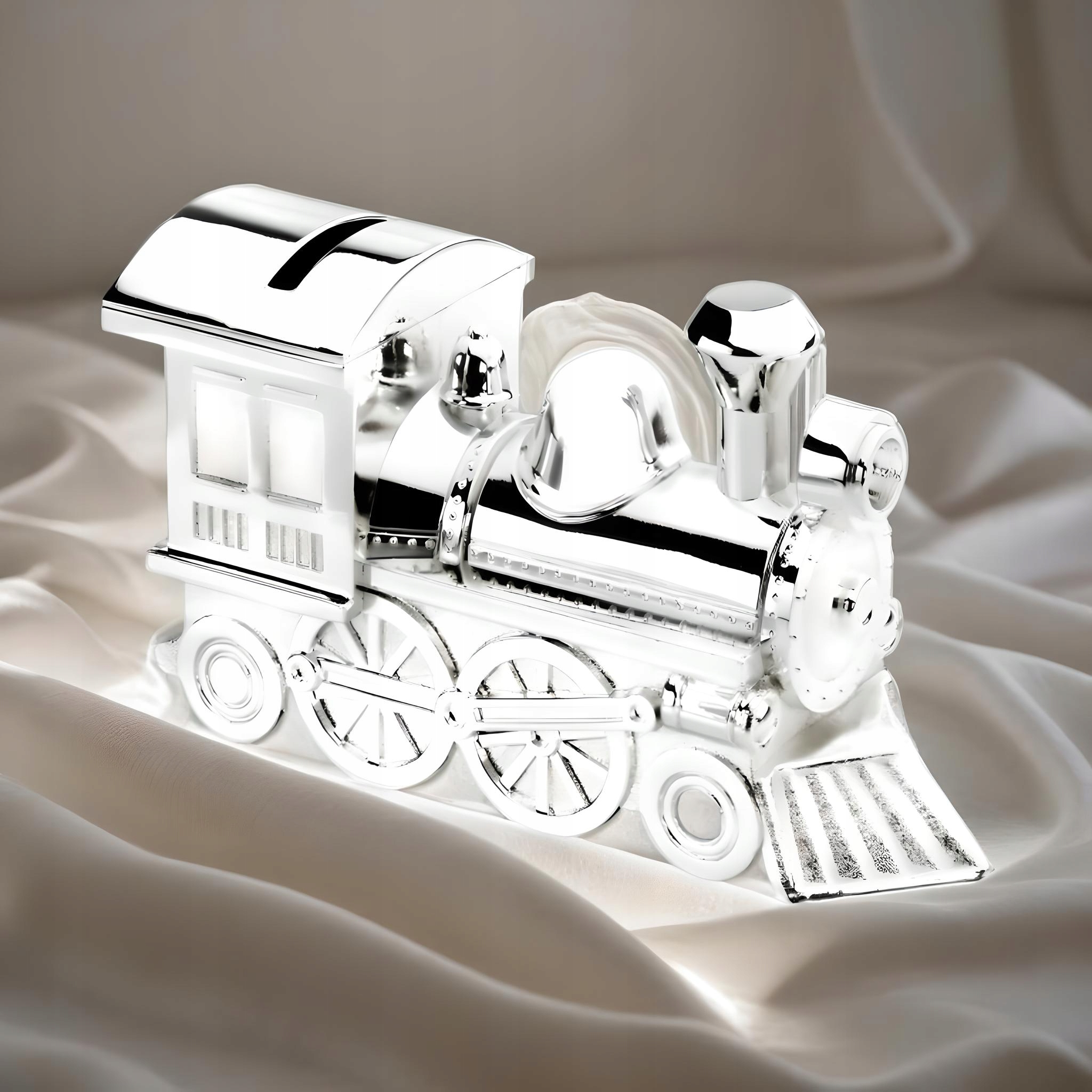 ✅ Skarbonka w kształcie lokomotywy – wykonana z wysokiej jakości metalu, posrebrzana i polakierowana