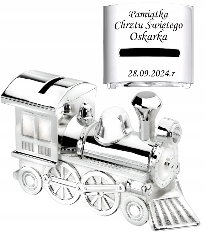 Skarbonka Srebrna LOKOMOTYWA z GRAWEREM GRATIS Prezent Na Chrzest Roczek
