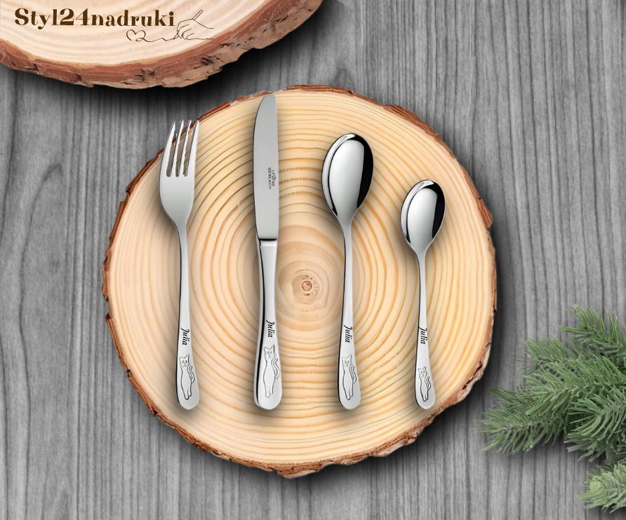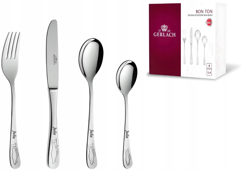 Sztućce dla dzieci GERLACH BON TON kotki GRAWER Prezent na Chrzest Roczek