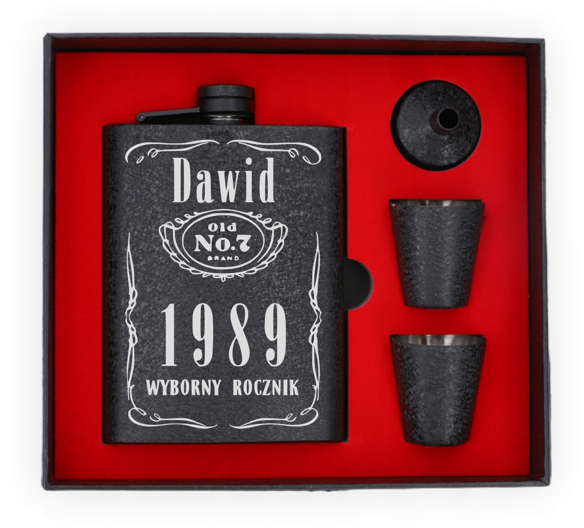 W zestawie znajdują się: piersiówka, 2 kieliszki (35 ml) oraz praktyczny lejek, który ułatwia korzystanie z piersiówki