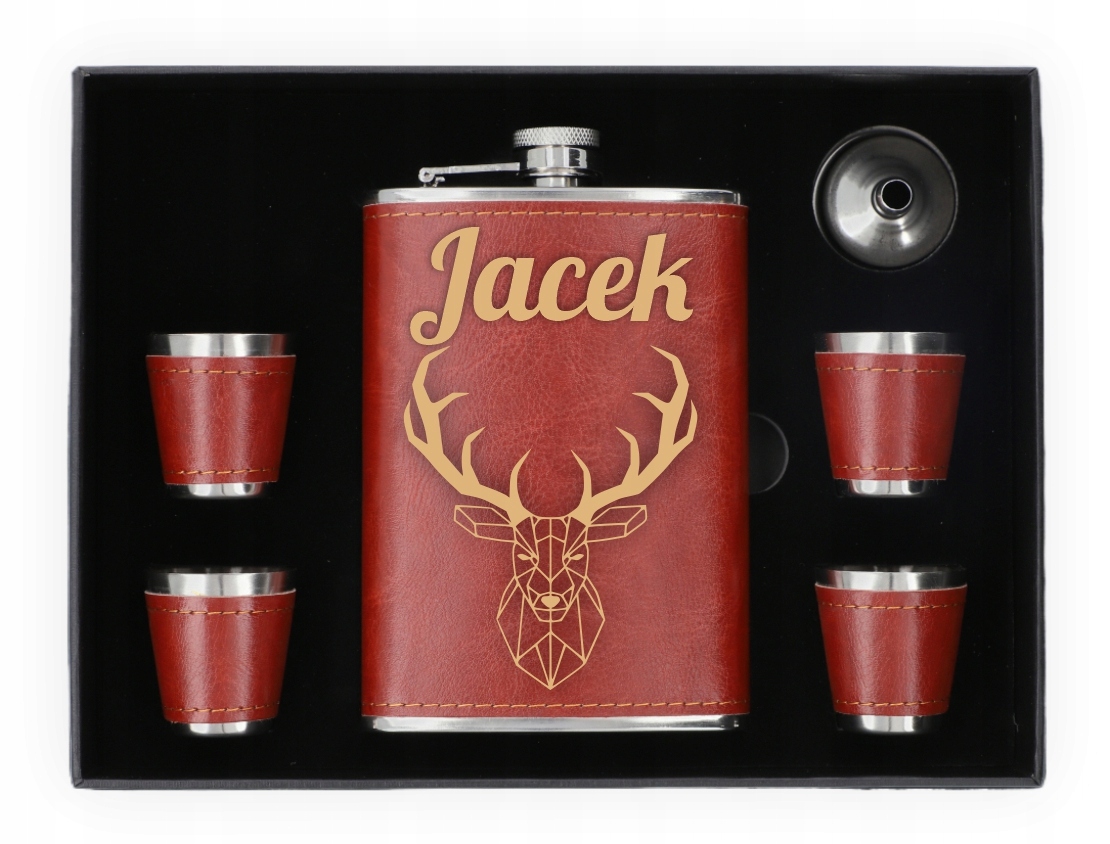 W zestawie znajdują się: piersiówka, 4 kieliszki (35 ml) oraz praktyczny lejek, który ułatwia korzystanie z piersiówki